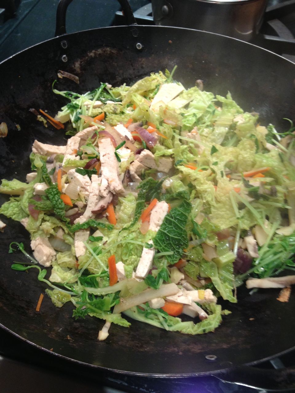 2. In the 20 minutes or so of that, you can begin to water saute the garlic with herbs of your choice, wash and chop up the broccoli raab into 2-3 inch pieces to make it easier to eat in a normal mouthful. Toss the broccoli raab into the garlicky, salty, herby water and cover, stirring occasionally for about 10 minutes.